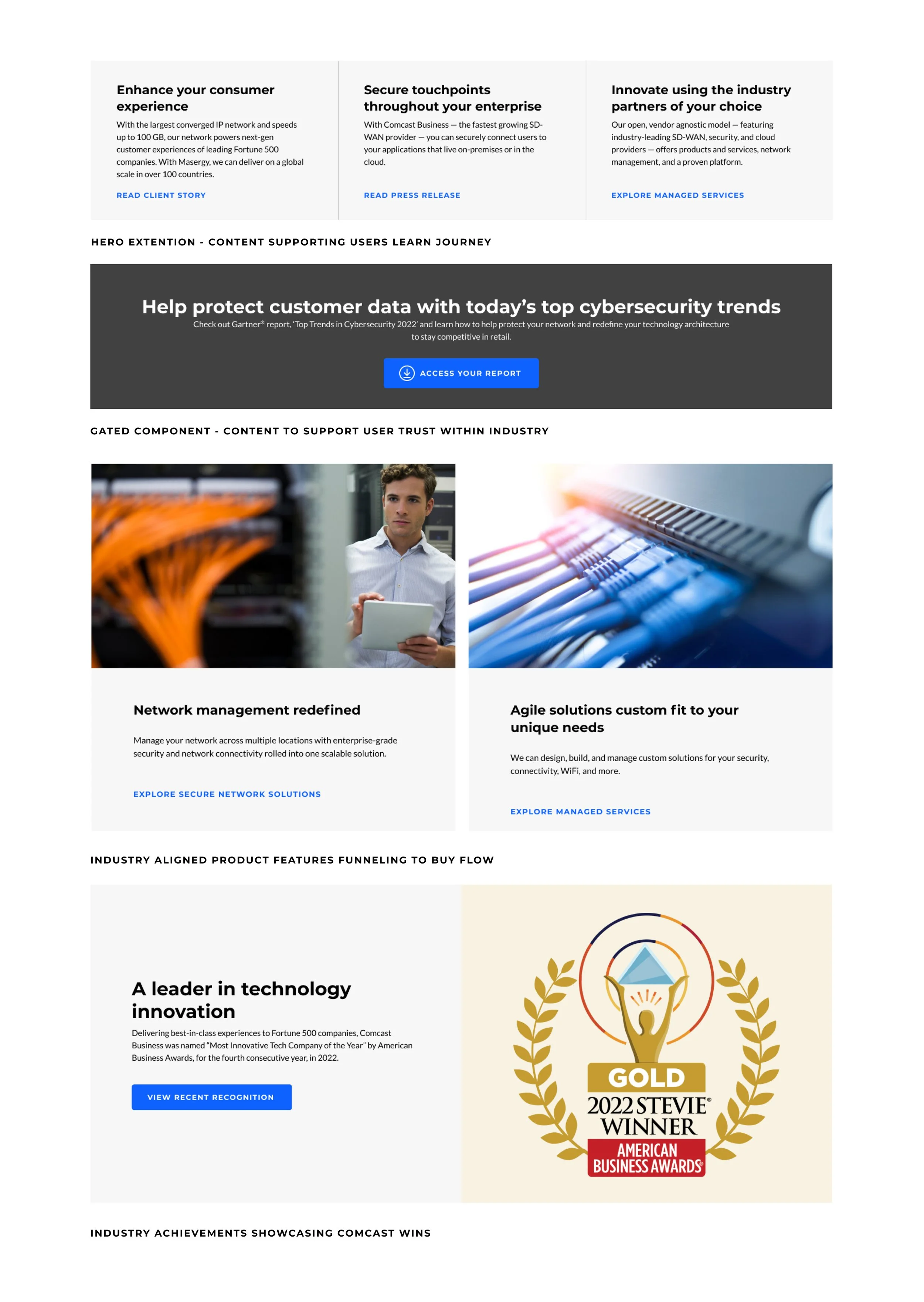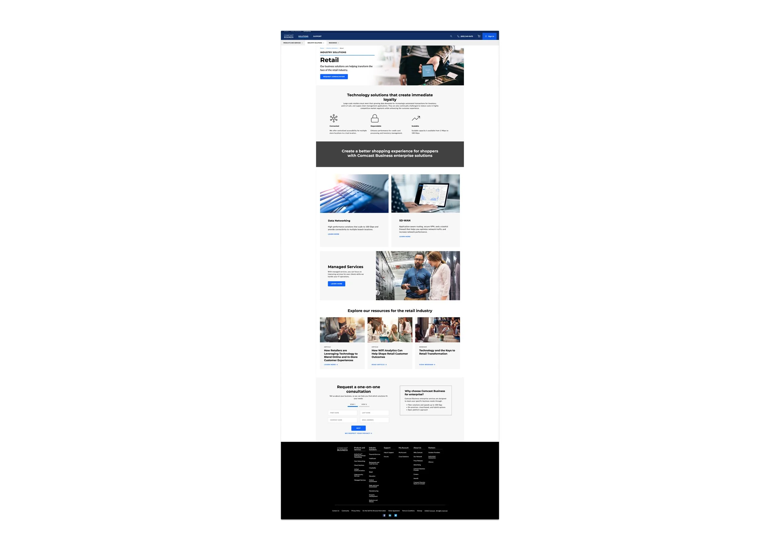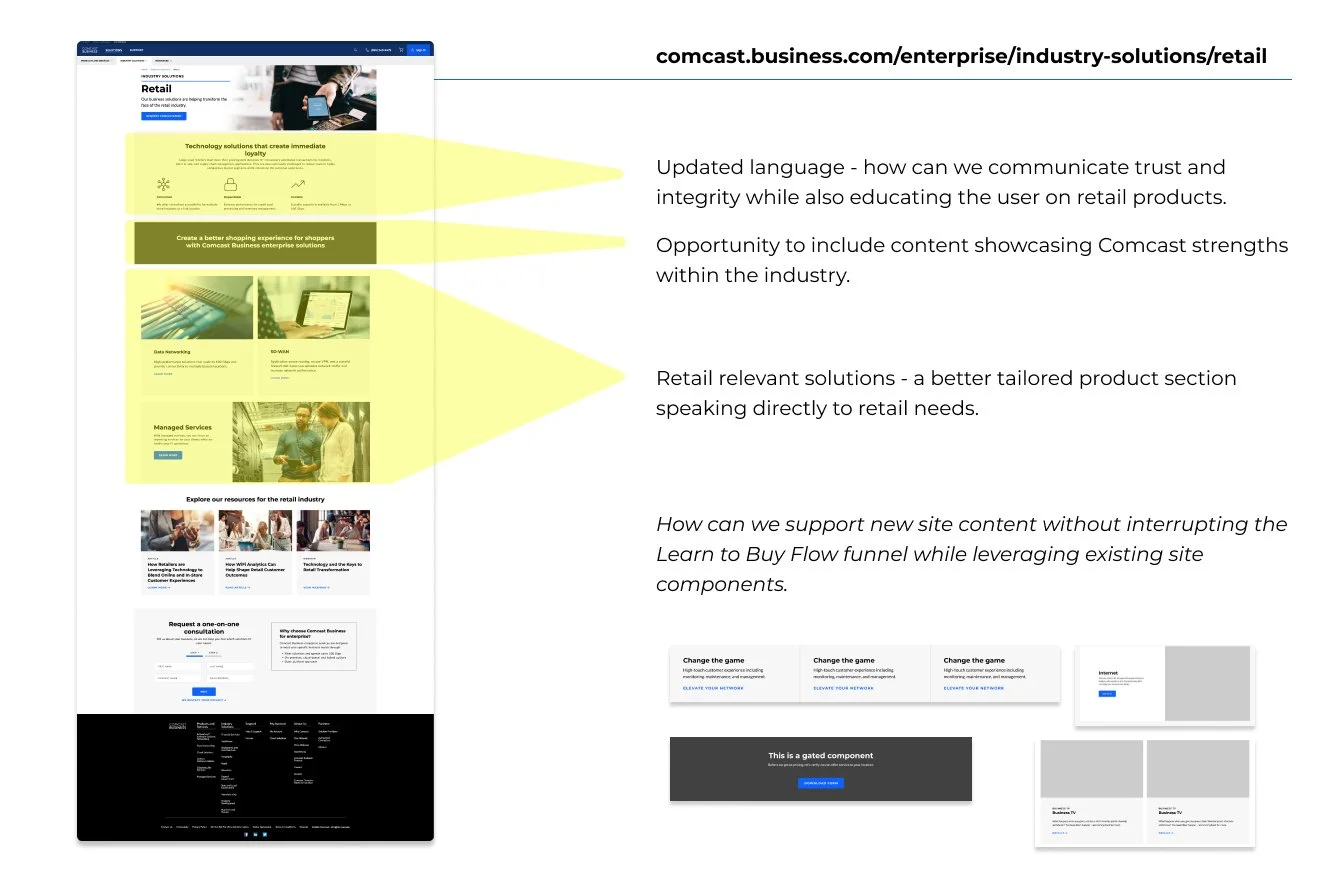 Working with marketing and analytics, we identified key content areas for development. At intake, the page content spoke of offered services - some of which not relevant to potential and existing Enterprise Retail customers, while overlooking Comcast’s Industry achievements which would further resonate with the customer, ultimately building trust - leading to conversion. There was also a great opportunity to leverage updated content and copy language across the experience.
