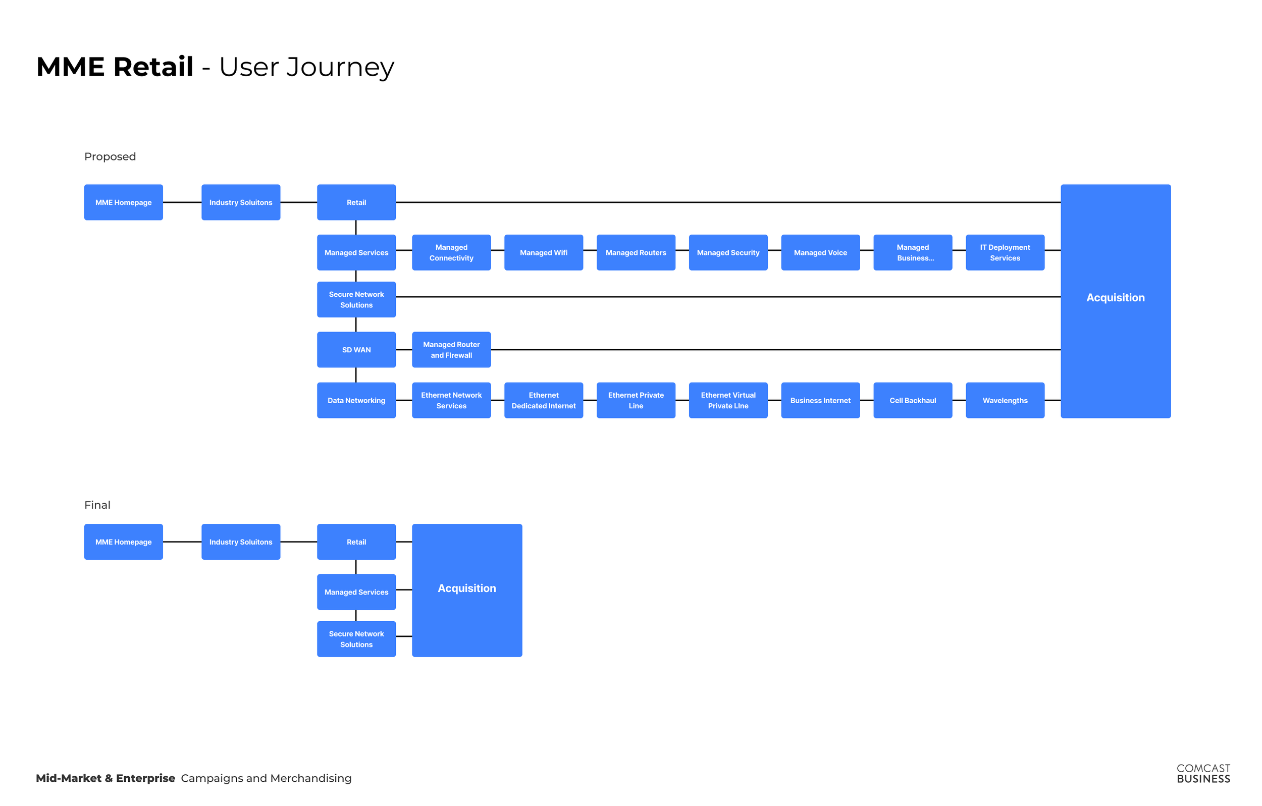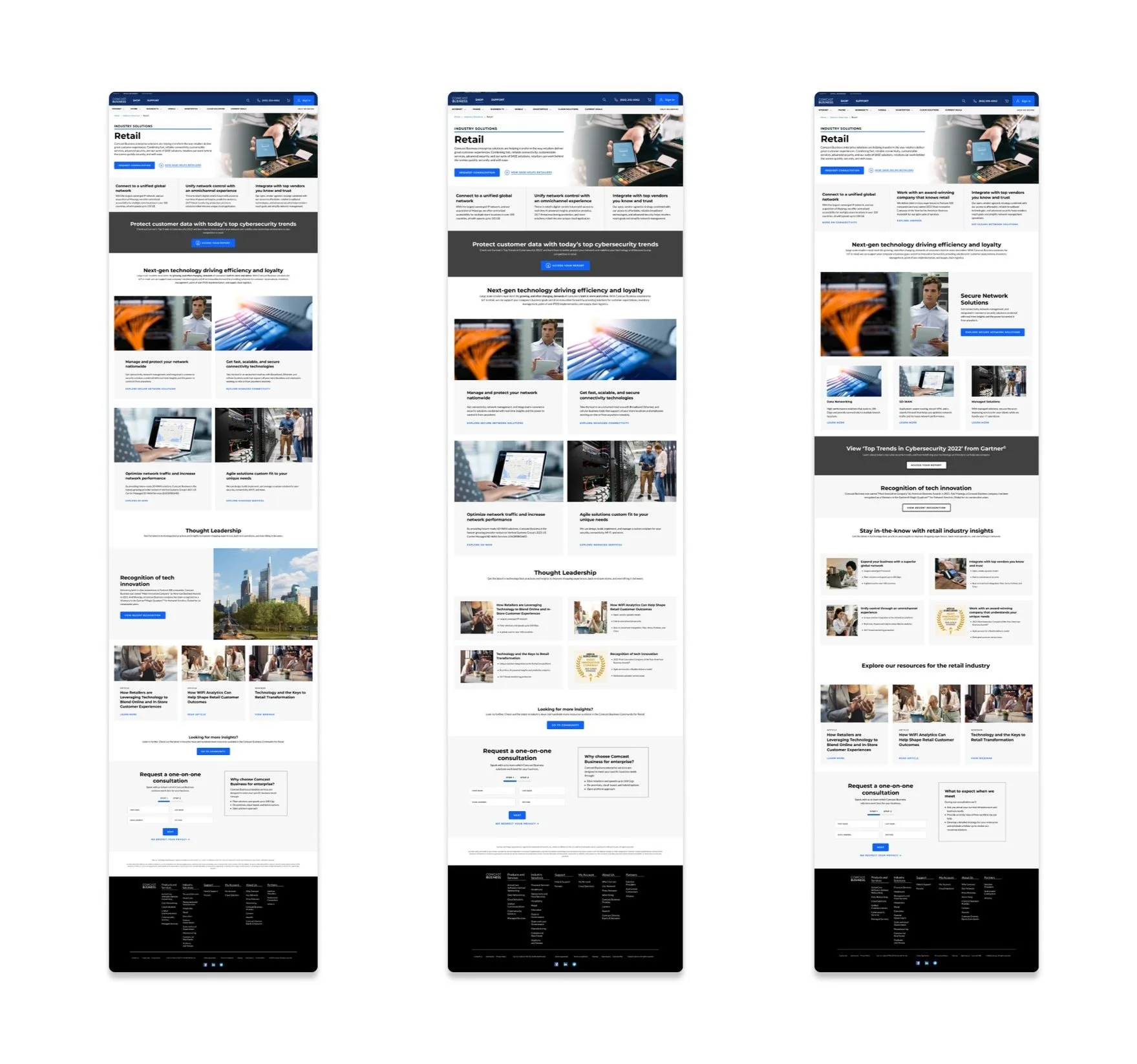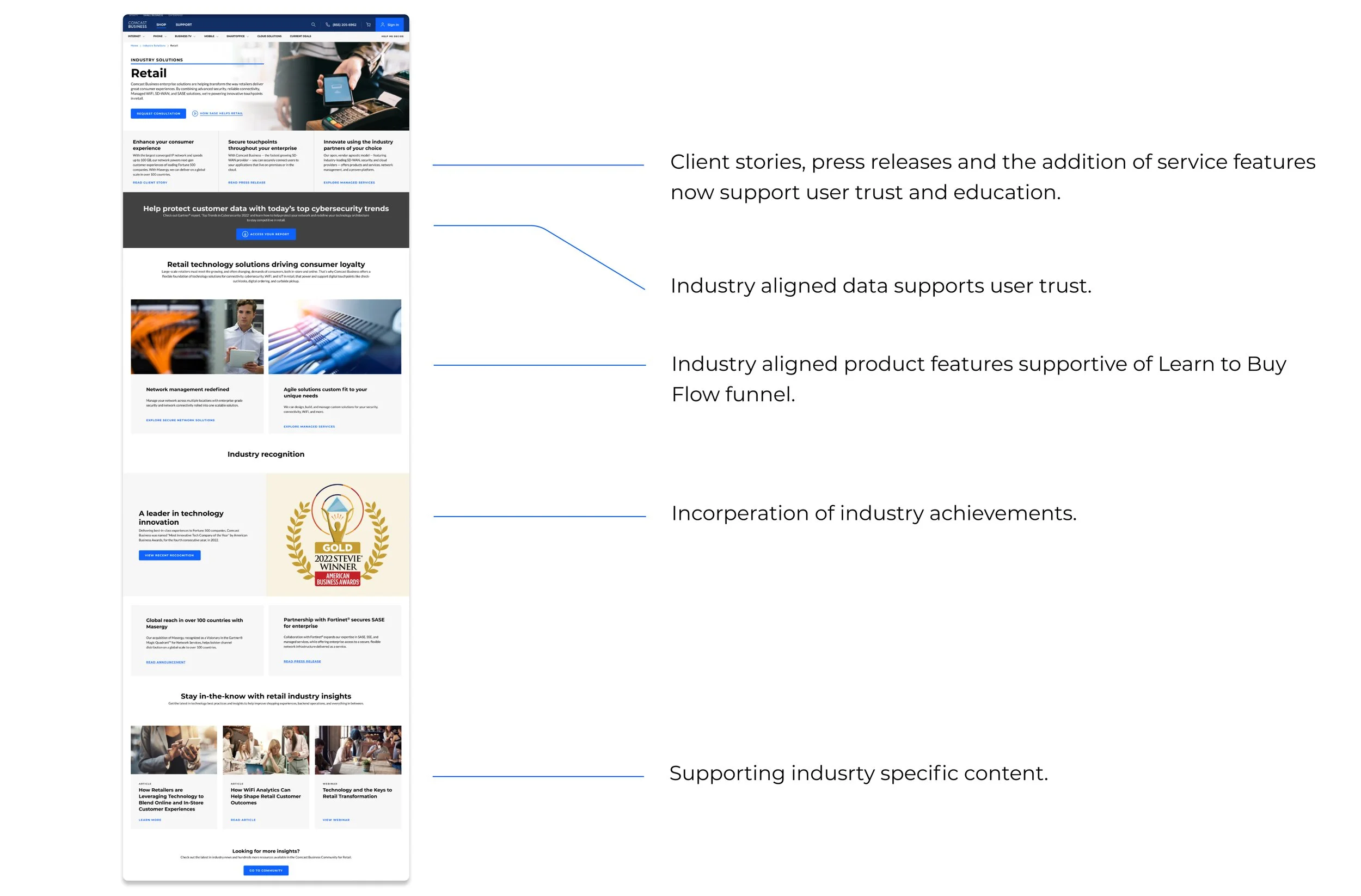 Working with marketing and analytics, we identified key content areas for development. At intake, the page content spoke of offered services - some of which not relevant to potential and existing Enterprise Retail customers, while overlooking Comcast’s Industry achievements which would further resonate with the customer, ultimately building trust - leading to conversion. There was also a great opportunity to leverage updated content and copy language across the experience.